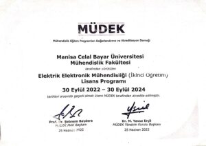 Bölümümüz 2018 yılından itibaren belirli periyotlarla MÜDEK tarafından akredite edilmektedir. Bu kapsamda 30 Eylül 2024 tarihine kadar akredite edilmiştir. Normal ve ikinci öğretim programları için akreditasyon belgeleri aşağıda verilmiştir.